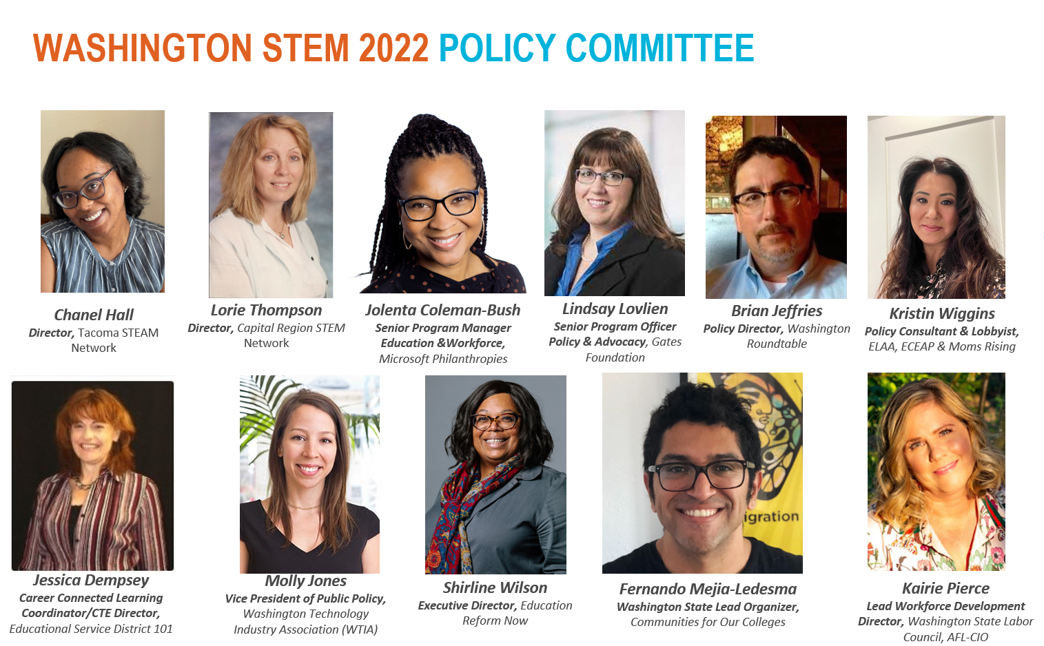 Special thanks to our 2022 Policy Committee for their support in the development of these legislative priorities: Chanel Hall, Director, Tacoma STEM Network; Lorie Thompson, Director, Capital Region STEM Network; Jolenta Coleman-Bush, Senior Program Manager, Education & Workforce, Microsoft Philanthropies; Lindsay Lovlien, Senior Program Officer, Policy & Advocacy, Gates Foundation; Brian Jeffries, Policy Director, Washington Roundtable; Kristin Wiggins, Policy Consultant & Lobbyist, ELAA, ECEAP & Moms Rising; Jessica Dempsey, Career Connected Learning Coordinator, CTE Director, Educational Service District 101; Molly Jones, Vice President of Public Policy, Washington Technology Industry Association (WTIA); Shirline Wilson, Executive Director, Education Reform Now; Fernando Mejia-Ledesma, Washington State Lead Organizer, Communities for Our Colleges; Kairie Pierce, Lead Workforce Development Director, Washington State Labor Council, AFL-CIO.