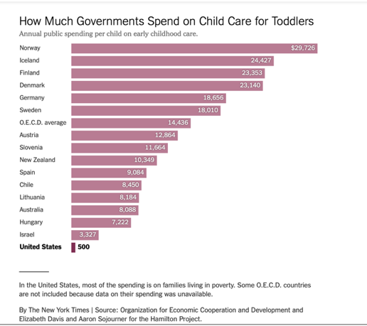 A nationwide report on childhood health and education indicators, Kids Count, states that despite $75 million in pandemic-related economic stimulus— which saved 3 million child care slots nation-wide—the lack of long term investment means the industry is still not meeting demand, costing the nation an estimated $122 billion a year through lost earnings, productivity and tax revenue. The U.S. spends only $500 per child each year on early care and education. Other industrialized nations spend 28 times this amount, on average $14,000 per child per year.