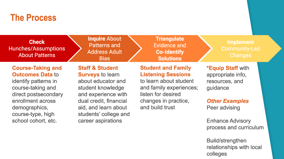 In 2019, staff at Eisenhower High School (EHS) wanted to understand how student enrollment in dual credit programs during high school correlated with their enrollment and completion of postsecondary programs. They partnered with Washington STEM and Yakima’s South-Central STEM network to access and analyze course-taking data and postsecondary enrollment data from the past five years. They also conducted surveys and interviews with staff and the 2,200-student body, 73% of whom are Latinx. When it was time to review and understand the patterns showing up in the data Washington STEM presented, EHS leadership engaged the entire school staff as critical partners to craft solutions to improve student awareness and access to dual credit.