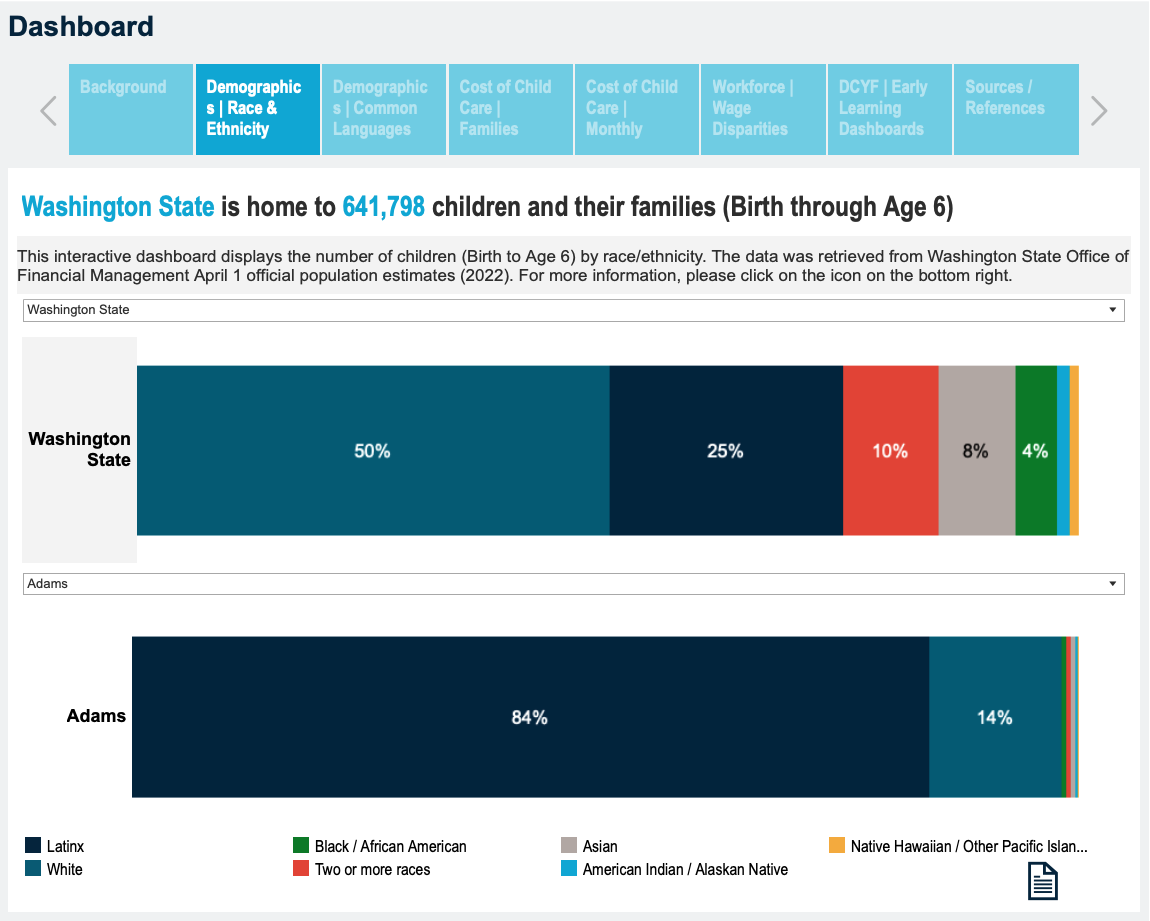 The first State of the Children (SOTC) reports were developed in 2020 in partnership with Washington Communities for Children (WCFC), a statewide network of 10 early learning coalitions representing some 600 organizations and individuals. WCFC’s early learning reports for the Northwest and Southwest regions of the state were the inspiration for Washington STEM’s ten State of the Children reports which provide region-specific demographic data, links to resources, and calculate the economic benefits of investing in early care and education. When it came time to update the report series in 2022, we responded to the early learning community’s request for more inclusive data and stories that reflect diverse communities in Washington. Our partners, WCFC put out a call with their networks inviting more diverse voices in the reports’ co-design and co-creation process so the reports better reflect community knowledge and experience. This partnership with WCFC was crucial to bringing voices of caregivers and child care providers into the two-page, data-rich reports.