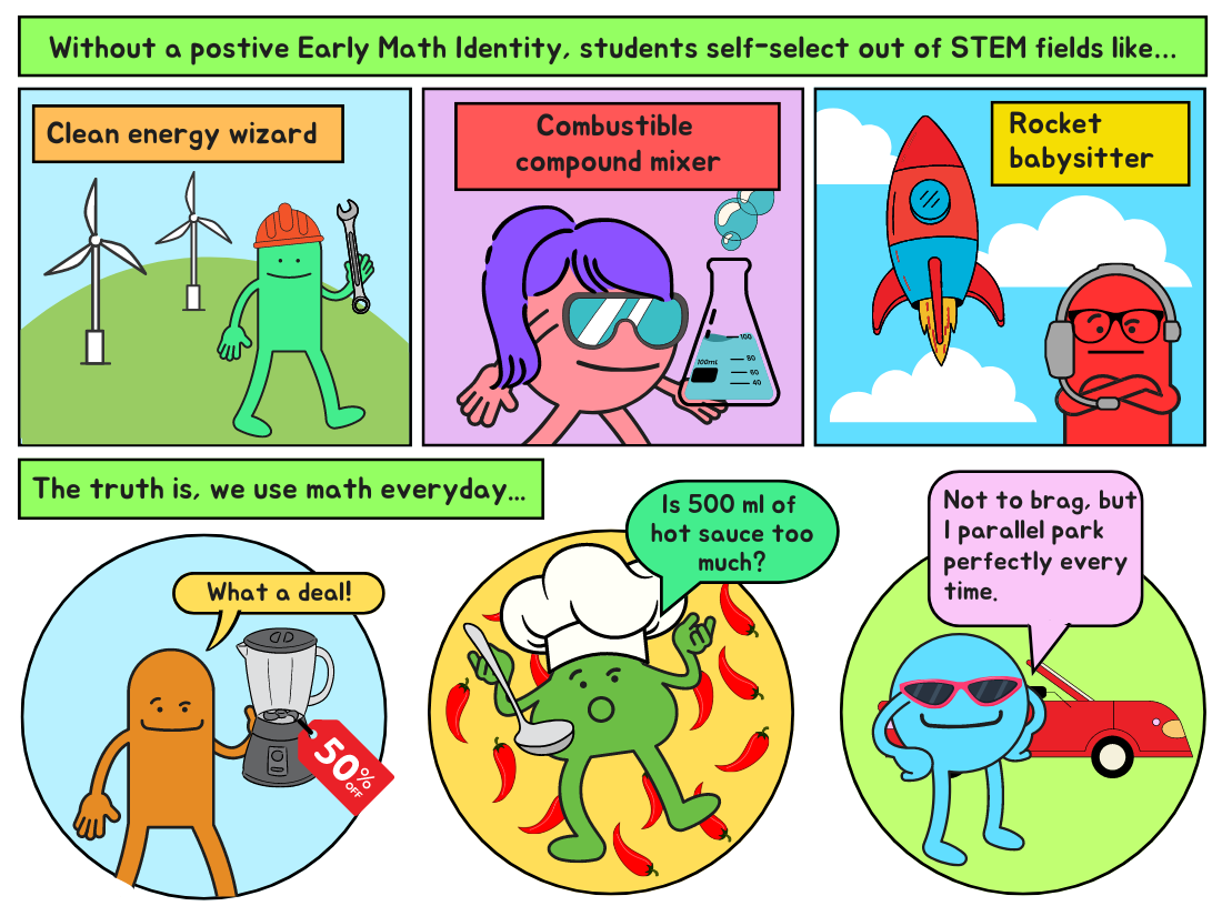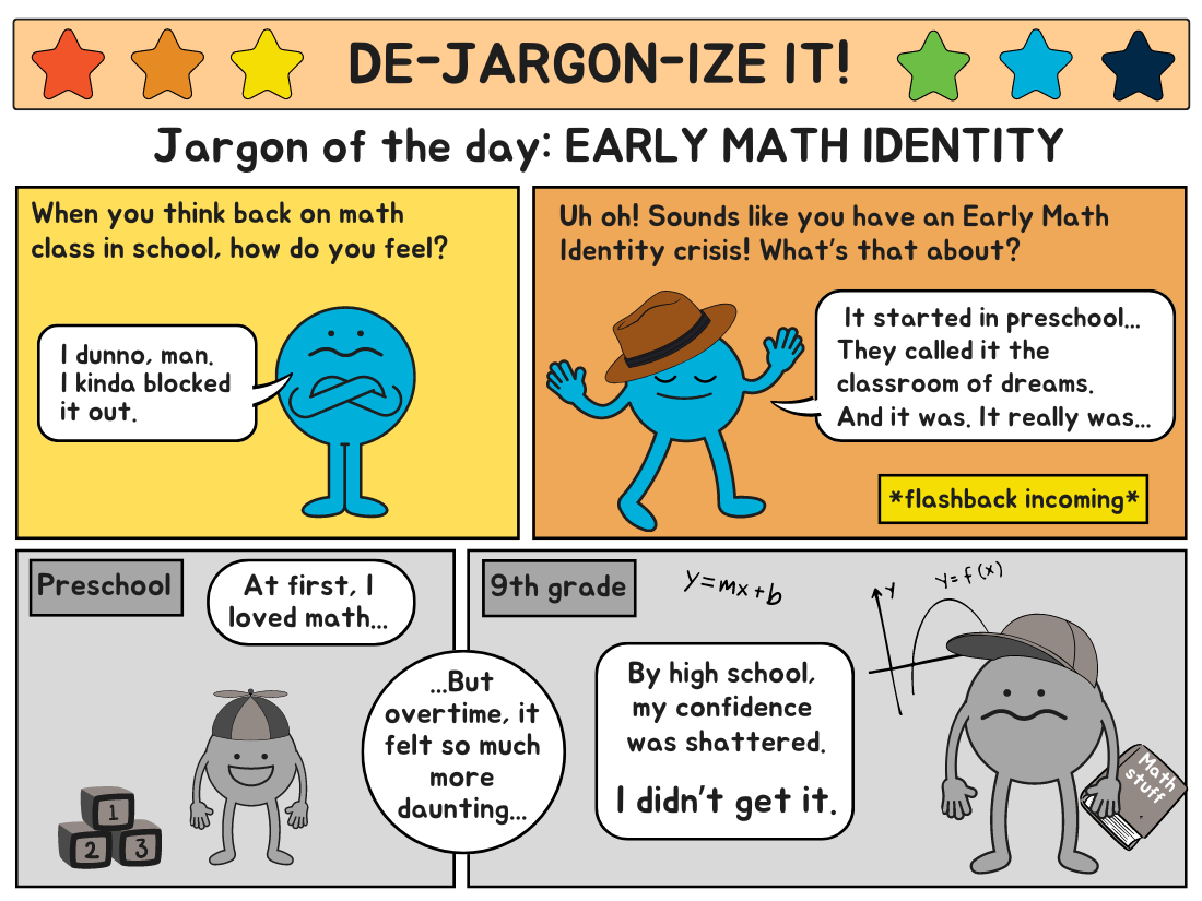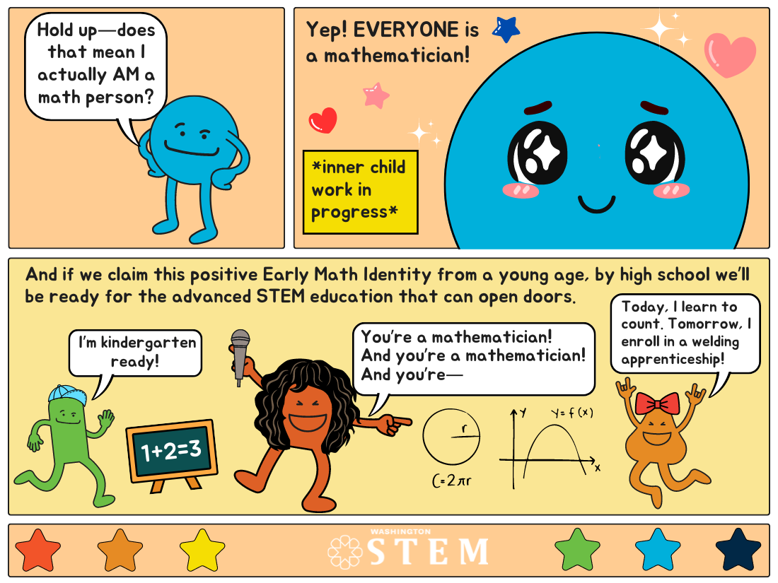 There is a lot of jargon in education advocacy. Here at Washington STEM, we are guilty of using a few five-syllable, fifty-dollar words ourselves. We created the De-Jargon-ize It! comics to help us all get on the same page, understand statewide education issues, and win Scrabble. In this issue, we're unpacking "Early Math Identity." If you've ever had a math-related identity crisis, this one's for you.