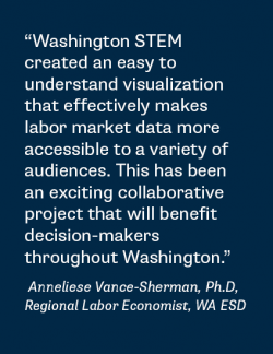 “Our mission at ESD is to provide our communities with inclusive workforce solutions that promote economic resilience and prosperity. One of the ways we work to accomplish this mission is by publishing labor market information that is free and available to all Washingtonians. Washington STEM created an easy to understand visualization that effectively makes labor market data more accessible to a variety of audiences. This has been an exciting collaborative project that will benefit decision-makers throughout Washington.” says Anneliese Vance-Sherman, Ph.D., Regional Labor Economist with WA ESD.