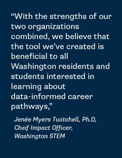 “Washington STEM has deep ties to every region in our state through our STEM Network partners, which helps create essential, on-the-ground feedback from local communities. WA ESD is a trusted source for reliable data and with the strengths of our two organizations combined, we believe that the tool we’ve created is beneficial to all Washington residents and students interested in learning about data-informed career pathways,” says Jenée Myers Twitchell, Ph.D., Impact Director for Washington STEM.