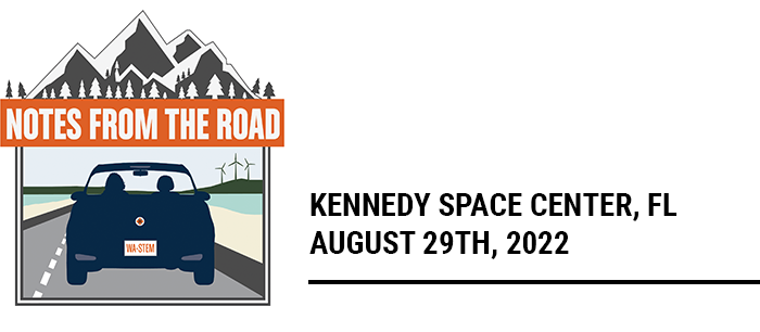 Very early in the morning on August 29th, me, my dad, and an old pair of jeans were sitting in the Causeway bleachers at Kennedy Space Center (KSC), waiting for a rocket to launch. As a former NASA intern, my last gig before becoming Washington STEM’s Communications Coordinator, I had spent four months writing for a young audience about the Artemis I launch. Now, my Dad and I were about to see it happen for real. Across the lagoon from us, the Space Launch System rocket (SLS) glittered in floodlighting, all dressed up and ready to shoot into space. We were ready too, equipped for the long day ahead with sunscreen, bug spray, bottled water, beef jerky, and lucky space pants.