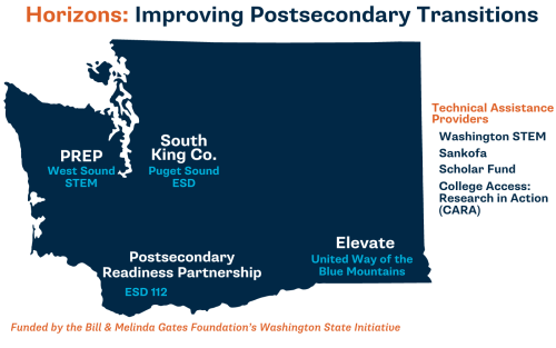 Washington STEM will manage the Horizons grants, a four year regional partnerships to boost student transitions from high school to 1-year certificate programs, two- and four-year degree programs and apprenticeships. The Horizons partnerships, funded by the Bill & Melinda Gates Foundation includes K-12 schools, colleges, and community-based organizations in the Olympic and Kitsap peninsulas, the Southwest region, the Palouse, and South King County. Read the announcement of the four-year grant here.